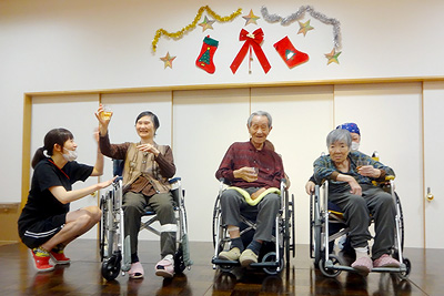 12月24日の昼食にクリスマス会が開かれ、沢山のご馳走とご利用者さんが職員の余興で楽しみます。